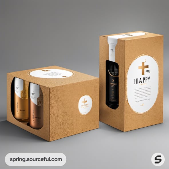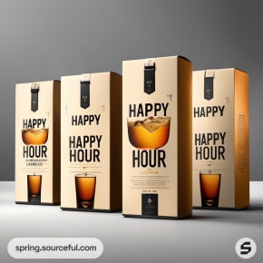 Two tall golden boxes with 'HAPPY HOUR' design, showcasing premium packaging details.