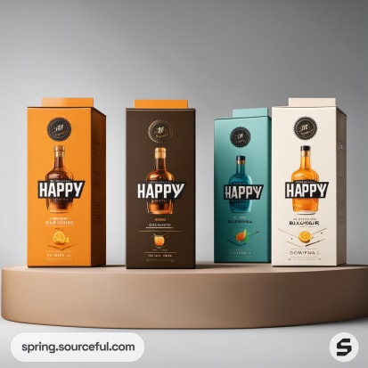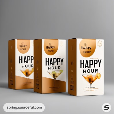 Row of 'HAPPY HOUR' cocktail boxes in different shades, with partially visible bottle design.