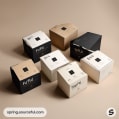 Assorted eco-friendly cardboard boxes with minimalist design in black, white, and beige colors on a beige background.