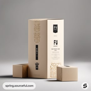 Tall beige cardboard box with minimal black graphics and text, set against a neutral background.