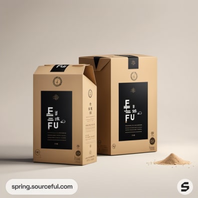 Two elegant cardboard boxes of food products against a beige background, one featuring white and black bowls with food.