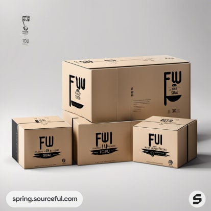 Set of four brown cardboard boxes with bold black text and logos on a plain background.