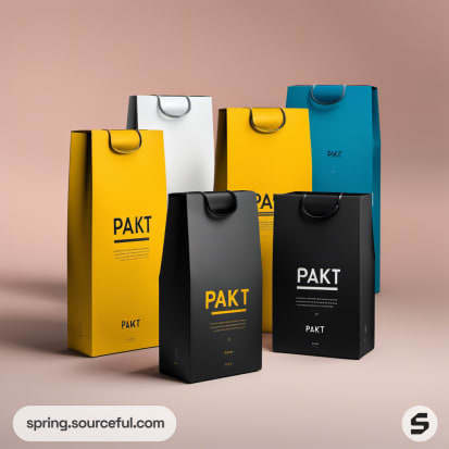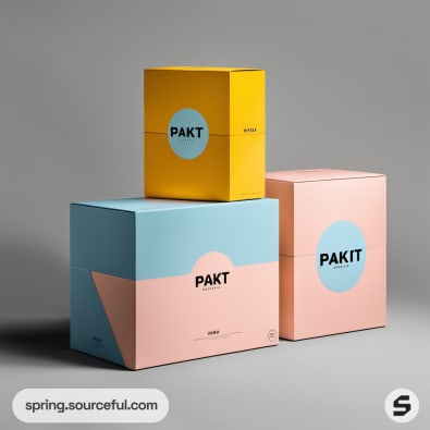 Multiple stacked colorful boxes with 'PAKT' branding on a brown backdrop.
