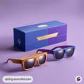 Two pairs of sunglasses with wood-textured frames, one orange and one blue, next to a blue and purple box on a purple background.