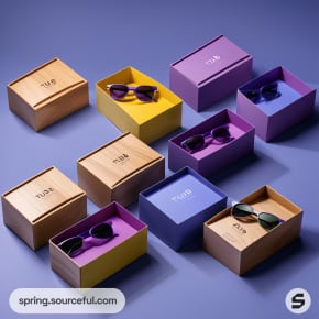 Purple sunglasses in an open purple box with a closed box beside, set on a wooden surface against a purple backdrop.