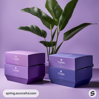Stacked purple and blue rectangular boxes with plant in background, on a purple surface.