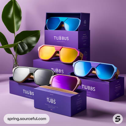 Boxed sunglasses in vibrant colors displayed on purple background.