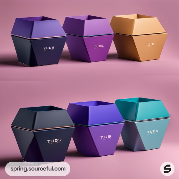 Assorted colorful hexagonal tubs on a pink background.