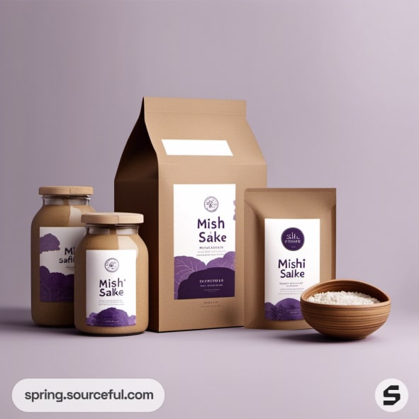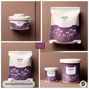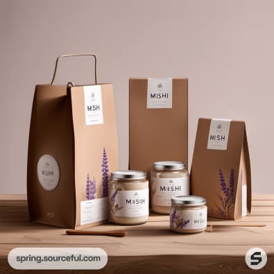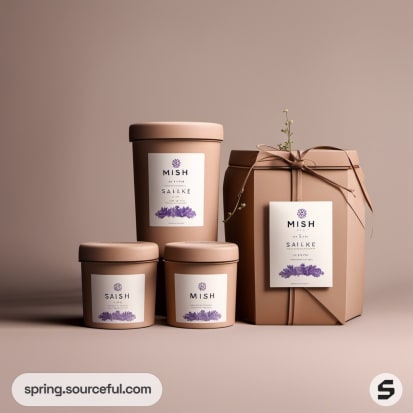 Brown paper box and jars with purple label designs.
