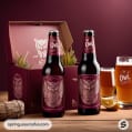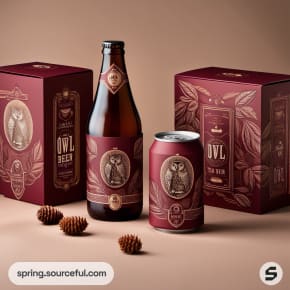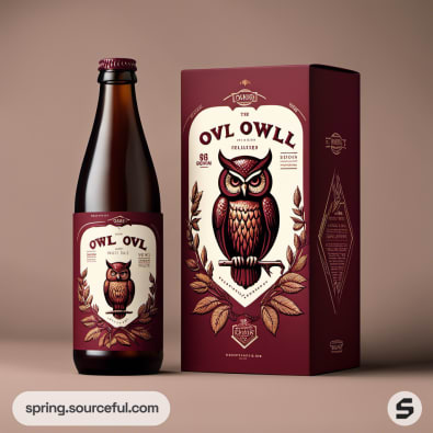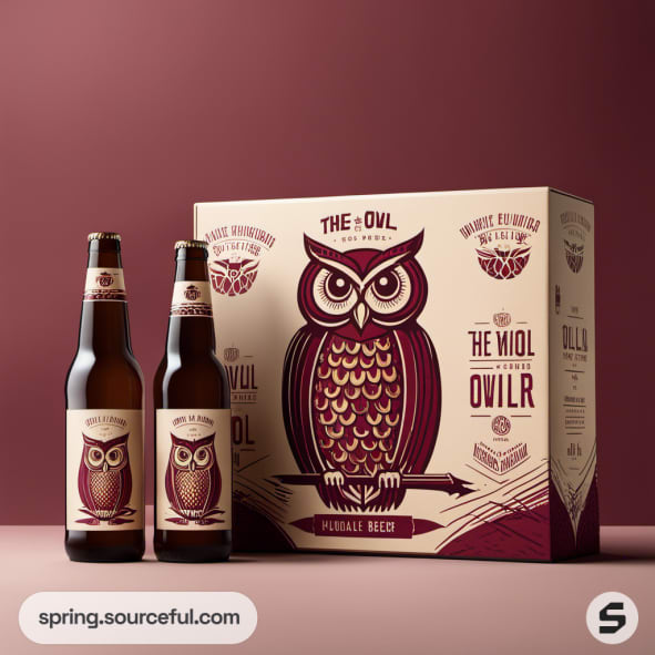 Owl-themed beer bottle next to a matching maroon rectangular box.