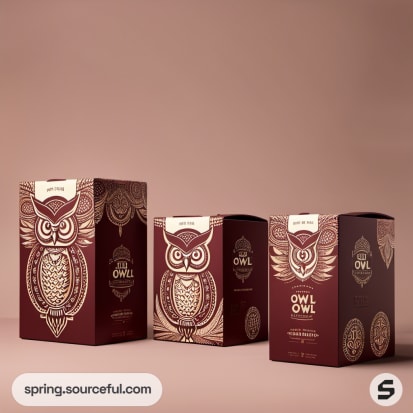 Maroon and beige owl-themed boxes with intricate designs displayed.