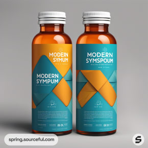 Two amber bottles with teal and orange geometric patterns on gray background.