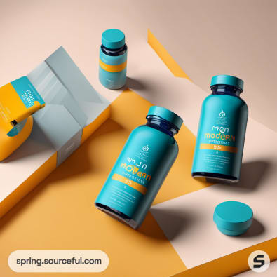 Blue and orange supplement bottles on a geometric yellow and peach background.