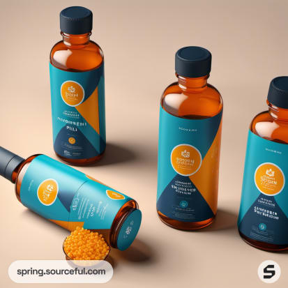 Amber bottles with teal and orange labels, black caps; capsules spill from one.