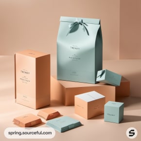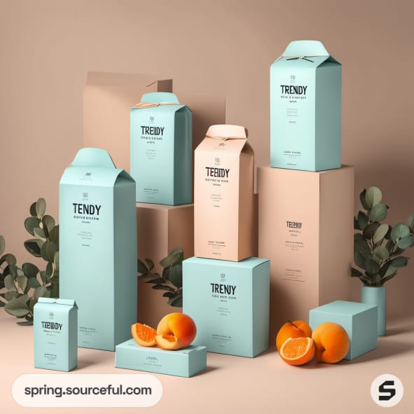 Pastel boxes with 'TRENDY' label in blue and peach on a beige surface.