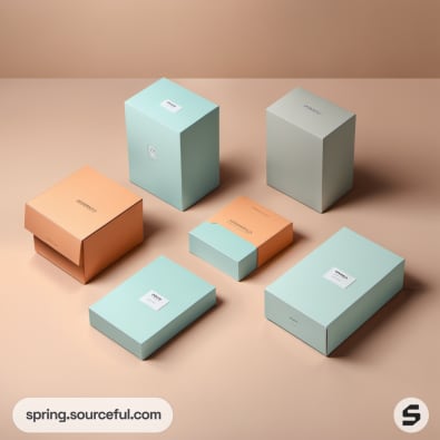 Various pastel-colored boxes in blue and peach on a beige backdrop.