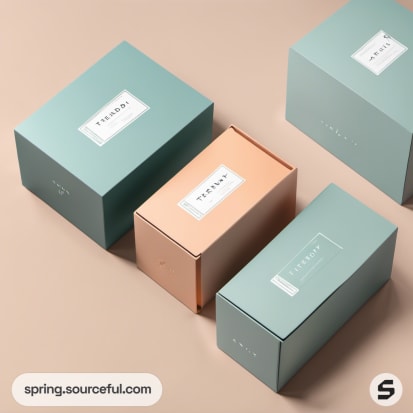 Close-up of pastel green and peach boxes on a beige surface.