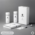 Elegant white packaging with cylindrical containers.