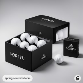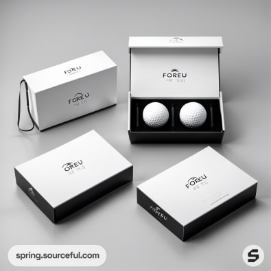 White minimalist box with golf balls on gray background.