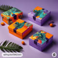 Tropical-themed boxes with floral and leaf designs on purple and orange backgrounds.