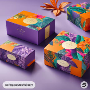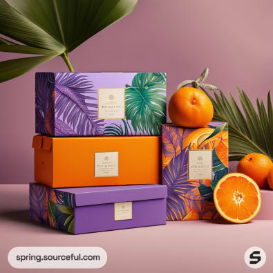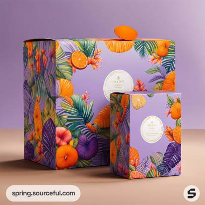 Colorful floral-patterned packaging boxes with tropical leaf designs and oranges against a purple background.
