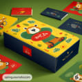 Colorful mailer box with bear illustration, surrounded by cards with animal designs on a green surface.