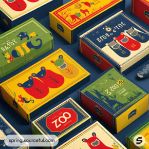 Colorful animal-themed boxes with playful illustrations on a wooden background.