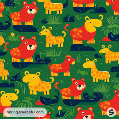 Cartoon animal and shoe pattern on dark background, featuring colorful bears, dogs, boots, and grass elements.