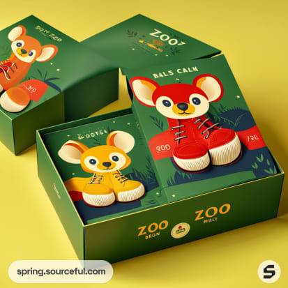 Colorful illustrated shoe boxes with animal designs in red, yellow, and blue on a blue background.