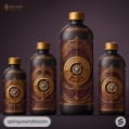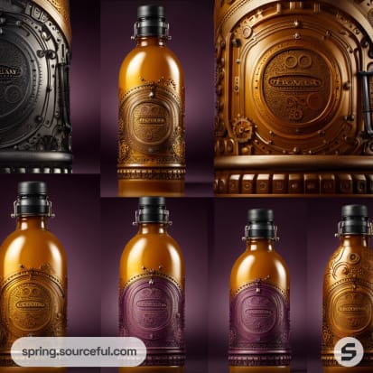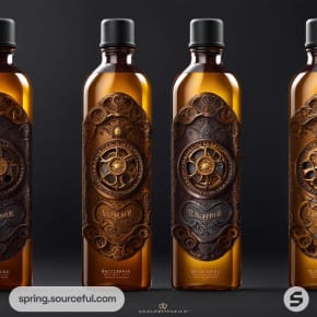 Brown bottles with intricate steampunk designs and black caps in a row.
