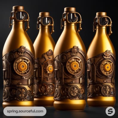 Gold bottles with intricate steampunk designs, featuring gears and dials on a dark background.