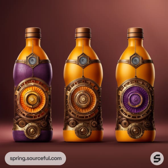 Three steampunk-themed bottles with intricate clockwork designs and vibrant orange and purple colors.