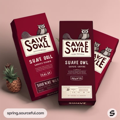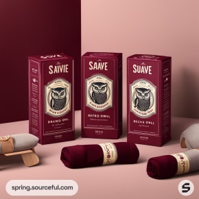 Trio of maroon owl-themed sock packaging boxes on a pink surface.
