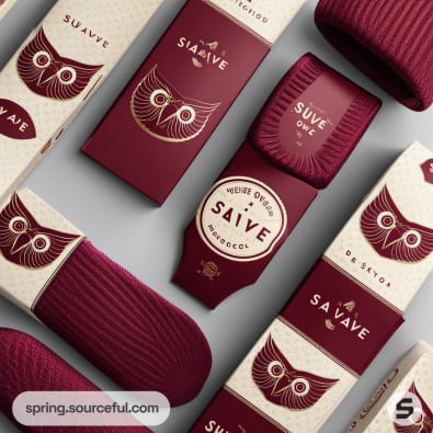 Assorted maroon and cream owl-themed packaging for socks on grey.