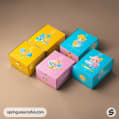 Various colorful boxes in yellow, pink, and blue with anime designs on a pink surface.