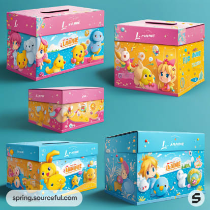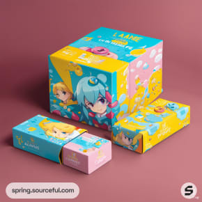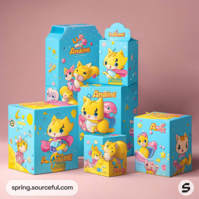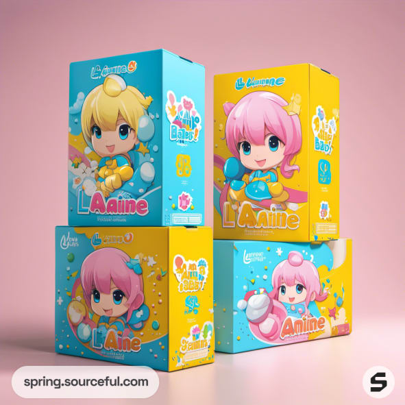 Stacked boxes with cute anime characters in blue, pink, and yellow designs on a pink background.