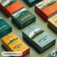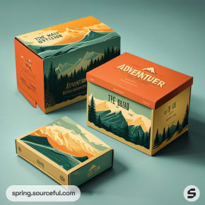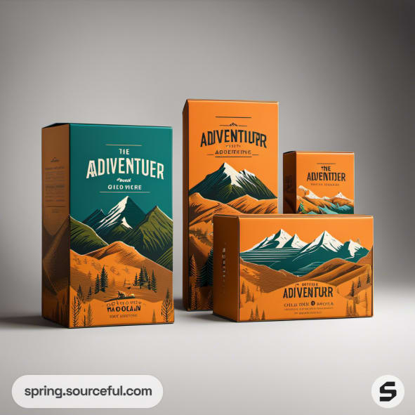 Mountain-themed packaging boxes with teal and orange designs.