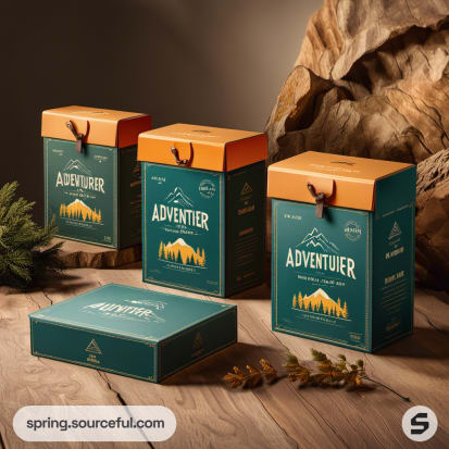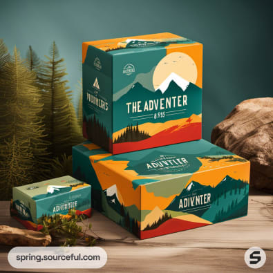 Adventure-themed boxes with mountain illustrations and rustic style.
