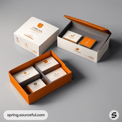 Luxurious gray and orange boxes with ribbon detail.