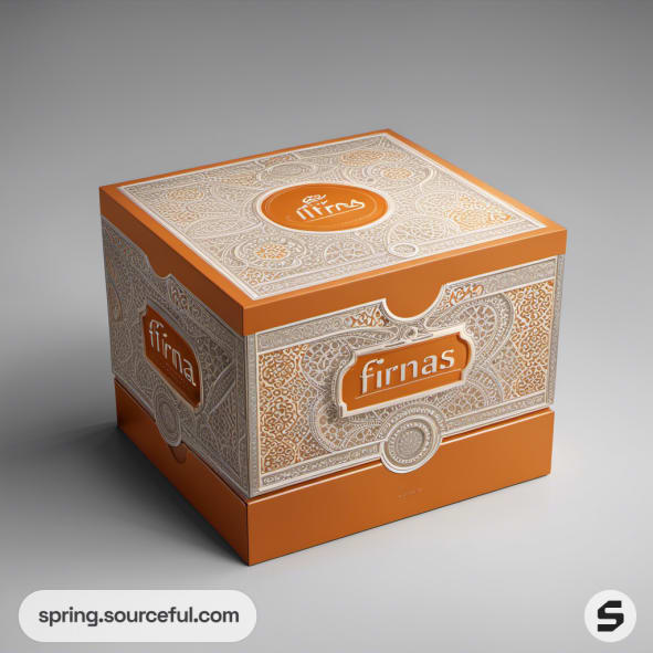Ornate square box with intricate orange and beige pattern.