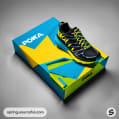 Two yellow and blue shoes displayed with matching packaging.