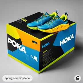 Blue and yellow shoe packaging with graphic design on wooden surface.