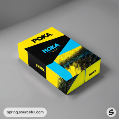 Yellow and black packaging box with blue accents and abstract design.
