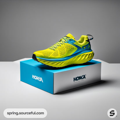 Neon green and blue running shoe on a blue and white box.