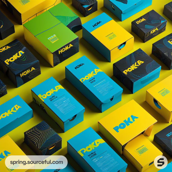 Tall boxes with yellow and blue shoes in abstract styled packaging.