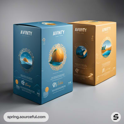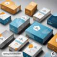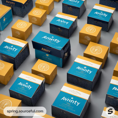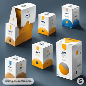 Assorted blue and yellow product boxes with sleek design on gray background.