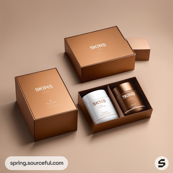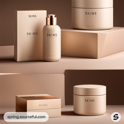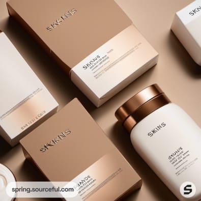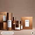 Tan and white skincare packaging with bottles and boxes arranged neatly.