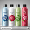 Three floral patterned shampoo bottles with roses in blue, pink, and red designs.