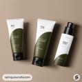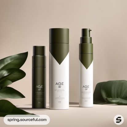 Olive green and white skincare bottles with box.