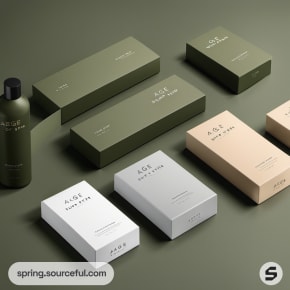 Skincare packaging boxes in various shades on olive background.